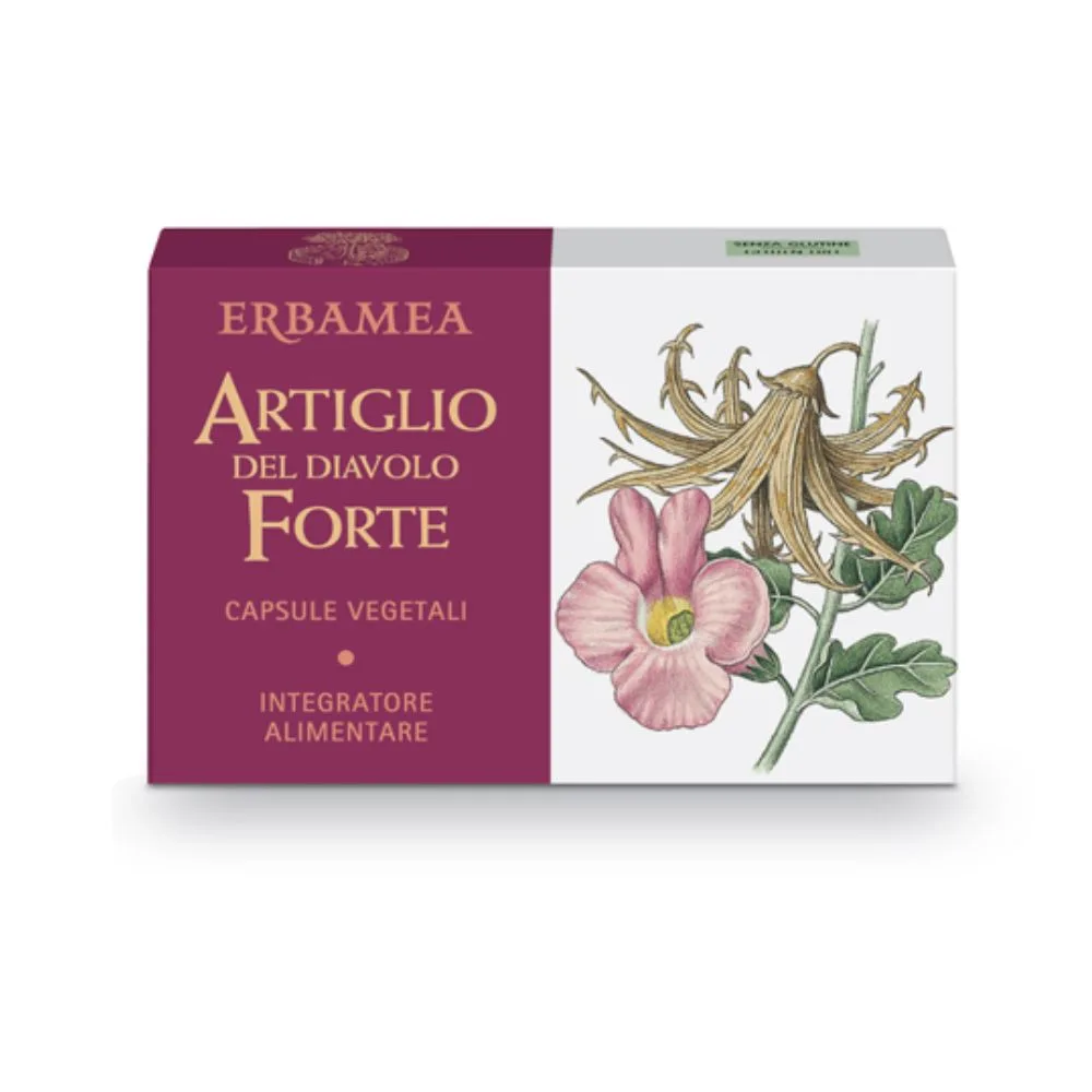 Erbamea Artiglio del Diavolo Forte è un integratore alimentare a base di estratto secco di radice di artiglio del diavolo (Harpagophytum procumbens), utile per favorire la normale funzionalità delle articolazioni e il benessere quotidiano.